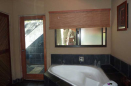 Le bungalow numéro 7, la suite honeymoon, est beaucoup plus grand, avec un coin salon et une grande baignoire.