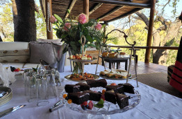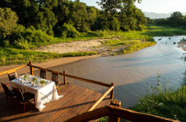 Les repas peuvent être servis dans l’élégante salle à manger, sur la terrasse pour une vue incomparable sur le lit de la rivière ou sous le ciel étoilé du boma.