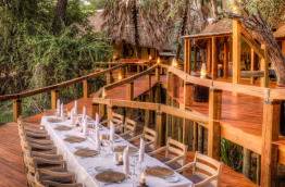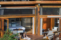 Les parties communes prennent place entre la piscine et le lagon, dans un bâtiment en bois aux chaudes tonalités. Une grande terrasse découverte permet de profiter du soleil. Les différentes parties du camp sont reliées par des passerelles en bois sur pilotis.