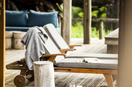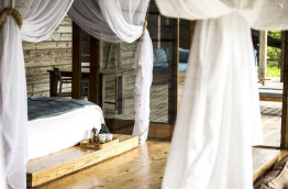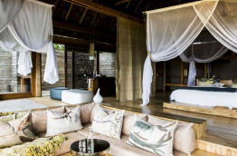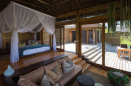 Vous bénéficiez d'une immense chambre équipée d'un luxueux lit avec moustiquaire, un grand salon en contrebas, un coin salon extérieur, une grande terrasse équipée de chaises longues et d'une petite piscine, d'une salle de bains avec deux lavabos, de toilettes, d'une grande douche intérieure et une autre douche extérieure.