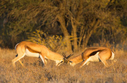 Vous serez accompagné par un bushmen de la tribu San, les meilleurs guides pour explorer les terres arides du Kalahari pour cette seconde journée dans le désert. Aujourd’hui, vous partez en safari en véhicule 4x4 puis à pied, à la rencontre d’une grande variété de prédateurs et d’herbivores, sans pour autant oublier les animaux plus timides comme la hyène brune ou le pangolin. En fin de journée, suivez les pas de vos guides lors d’un safari au coucher du soleil, une occasion unique de rencontrer certaines espèces nocturnes comme le blaireau ou la genette tachetée.