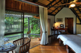 Les 12 chalets sont disséminés le long de la rivière, entourés de végétation et largement ouverts par de grandes baies vitrées avec balcon privatif, lits simples ou double et salle de bain avec douche.