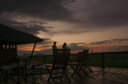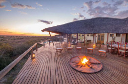 Un vaste bâtiment largement ouvert vers l’extérieur accueille les parties communes : bar, coin salon avec de confortables fauteuils, salle à manger et grande terrasse avec coin feu et piscine. La vue est extraordinaire et un télescope permet de surveiller l’activité des animaux sur le pan, tandis que le point d’eau, en contre-bas, attire souvent les lions.