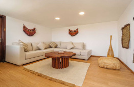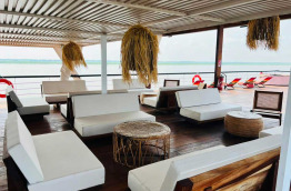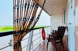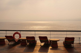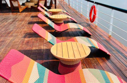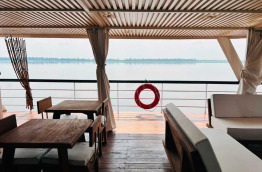 À bord du Princesse Ngalessa, le pont d’observation dispose d’une salle de sport, d’une terrasse avec un bain à jets et d’un salon extérieur équipé de fauteuils, canapés et tables basses.