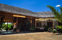 Les parties communes, réception, bar et restaurant, sont regroupées dans un bâtiment à toit de chaume largement ouvert vers l'extérieur.