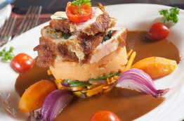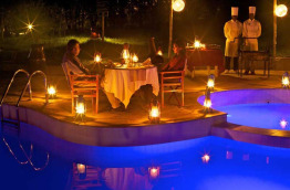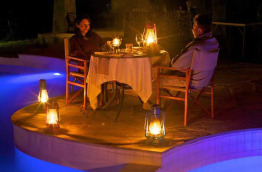 Les repas, très variés et à base de produits frais, sont servis sous forme de buffet dans la salle à manger largement ouverte vers l’extérieur.