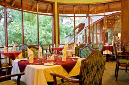 Le lodge est construit dans un immense et très beau parc ombragé par des acacias. Les parties communes sont immenses, tant la salle à manger que le bar, avec de grandes baies vitrées ouvertes sur le parc. Une jolie cheminée centrale, entourée de gros fauteuils, apporte une ambiance cosy.