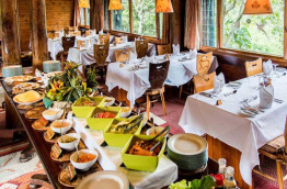 Les repas sont servis sous forme de buffet dans le restaurant panoramique qui surplombe le point d’eau et la forêt environnante.