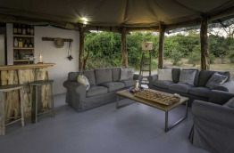 Les parties communes sont situées sous 2 tentes côte à côte, une abritant la table d’hôtes, l’autre un salon avec de confortables fauteuils où l’on se retrouve avant de partir en safari. Les tons sont naturels et apaisants, beige, brun et gris.