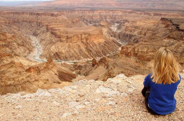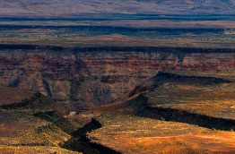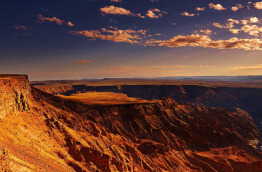 Départ matinal au Fish River Canyon pour profiter de la lumière rasante du début de journée (entrée à régler). Prenez de la hauteur depuis les belvédères qui offrent un panorama superbe. Il est strictement interdit de descendre dans le canyon. Une route gravillonnée, ponctuée de vertigineux points de vue, serpente le canyon rejoignant les villes de Hobas, située en haut du canyon, et Ai-Ais Hot Springs, une oasis en bas du canyon, au bord de la rivière. Découvrez les différentes facettes du Fish River Canyon, chaque méandre offre un spectacle différent et fascinant. Il faut environ 1 heure pour parcourir les 50 km qui séparent les deux portes d’entrée. Au milieu de ce paysage aride, on observe essentiellement des autruches et des oryx qui s’adaptent aux conditions du désert, mais soyez observateurs, des chevaux sauvages viennent souvent se rafraîchir au fond du canyon.