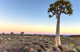 Départ matinal vers la ville de Keetmanshoop, la porte sur le Grand Sud namibien. À 13 km au Nord de la ville, la Quiver Tree Forest (entrée à régler au rest camp) se trouve sur les terres privées d’une ferme. L’arbre à carquois des San appelé Quiver tree en anglais et Kokerboom en Afrikaans, est une variété de plante aloès endémique de Namibie. On compte environ 250 arbres sur la propriété qui ont tous entre 200 et 300 ans. Ils peuvent atteindre jusqu’à 9 m de hauteur et sont très résistants à la sécheresse. Ils se parent de magnifiques fleurs de couleur jaune de juin à juillet, créant un décor féerique où déambulent d’innombrables damans qui y ont élu domicile. C’est une excellente halte sur la route de Windhoek.