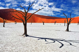 Sossusvlei offre une vaste étendue de paysages d’une beauté saisissante presque irréelle. Ce vaste lac asséché recouvert d’encroûtements de sel est entouré d’immenses dunes pouvant atteindre 325 m de haut. Les couleurs jaune et gris du sol contrastent avec l’ocre, le rouge flamboyant et le jaune des dunes, autant de nuances qui rendent ce lieu magique.