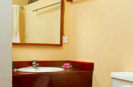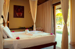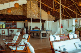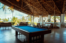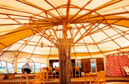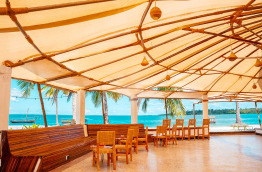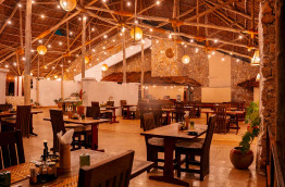 Le restaurant bar décoré avec des meubles en bois d’artisanat local est immense, il se termine par une grande terrasse qui surplombe le jardin. On vous servira un menu unique le soir, simple et concocté avec des produits frais, très souvent composé de fruits de mer et de poisson. L’hôtel prépare aussi des paniers pique-nique pour les plongeurs.